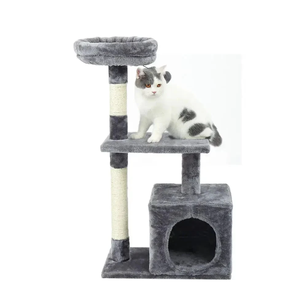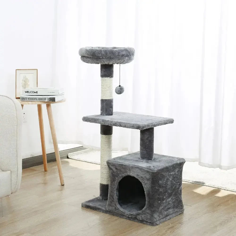 ARBRE A CHAT GRIS AVEC PLATEFORME ET BOULE PENDANTE