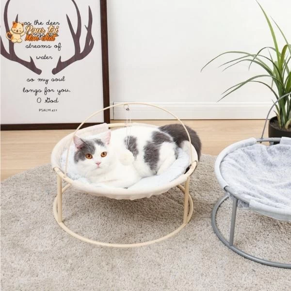 Nous vous proposons le HAMAC4CAT™, lit surélevé avec jouet pour chat en 45 cm de diamètre X 20 cm de haut + 23 cm de haut pour le support du pompon.